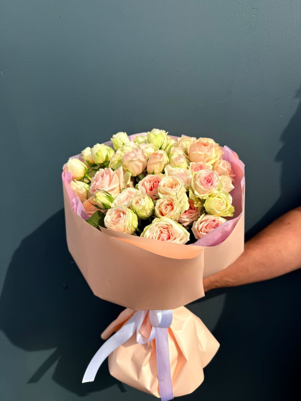 25 пионовидных кустовых роз Giselle с оформлением