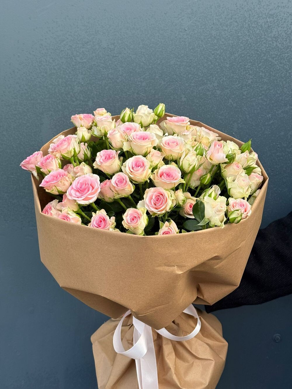 9 кустовых пионовидных роз Саммер Роуз в крафтовом оформлении