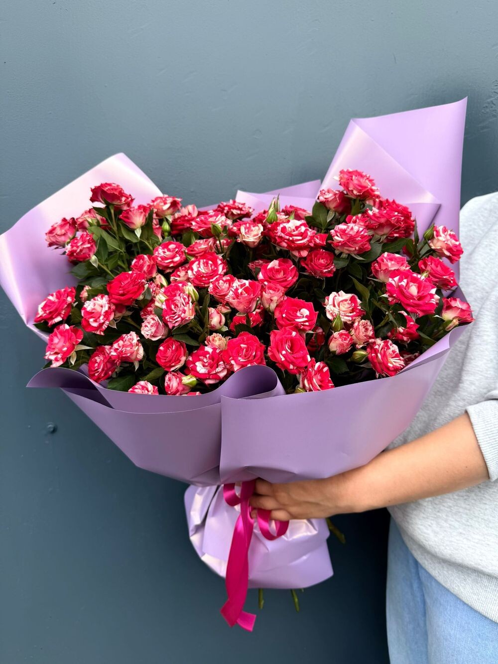 7 веточек кустовых пионовидных роз Кристи с оформлением