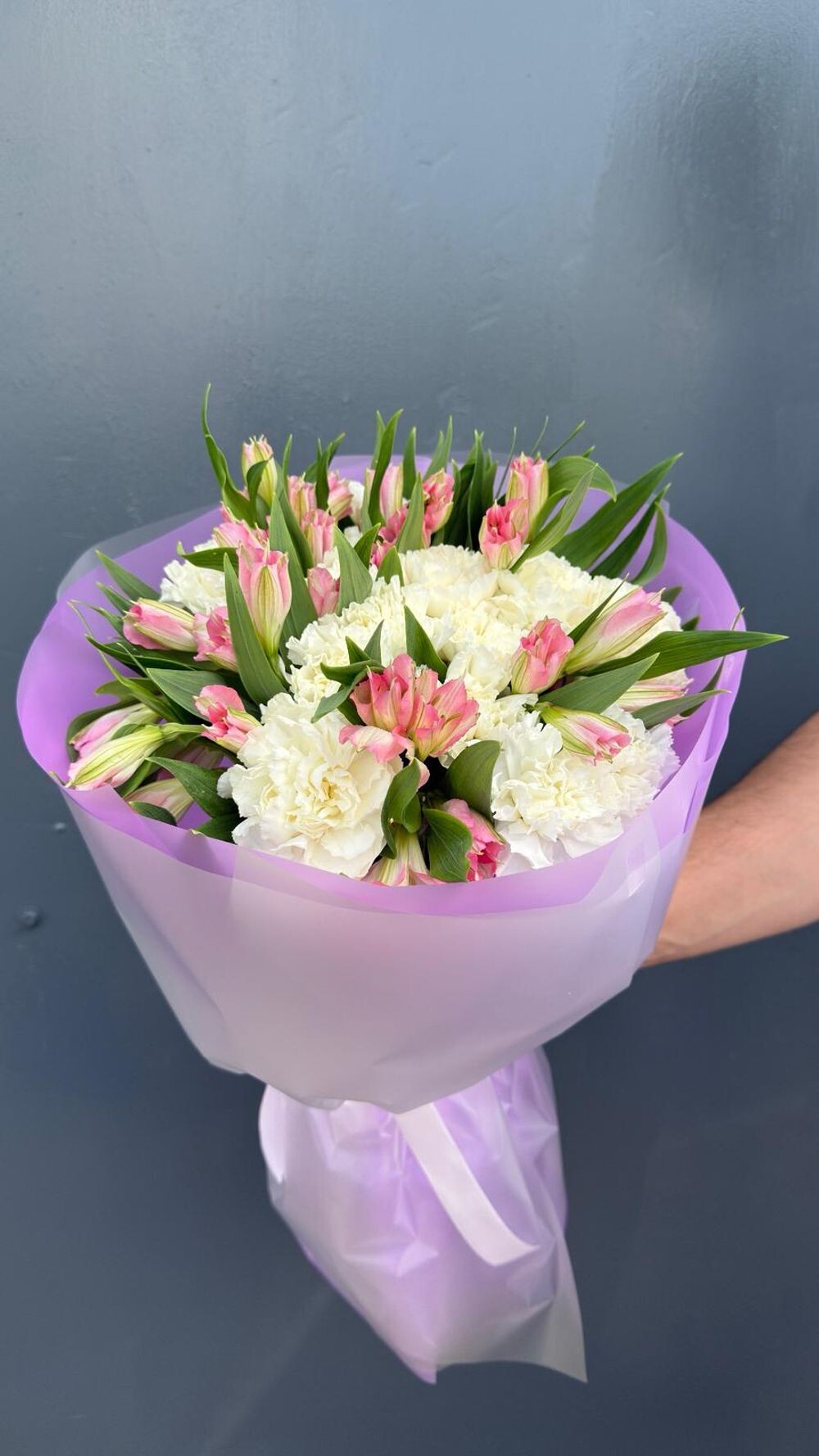 Букет из 10 белых диантусов + 9 розовых альстромерий в сиреневом бокале