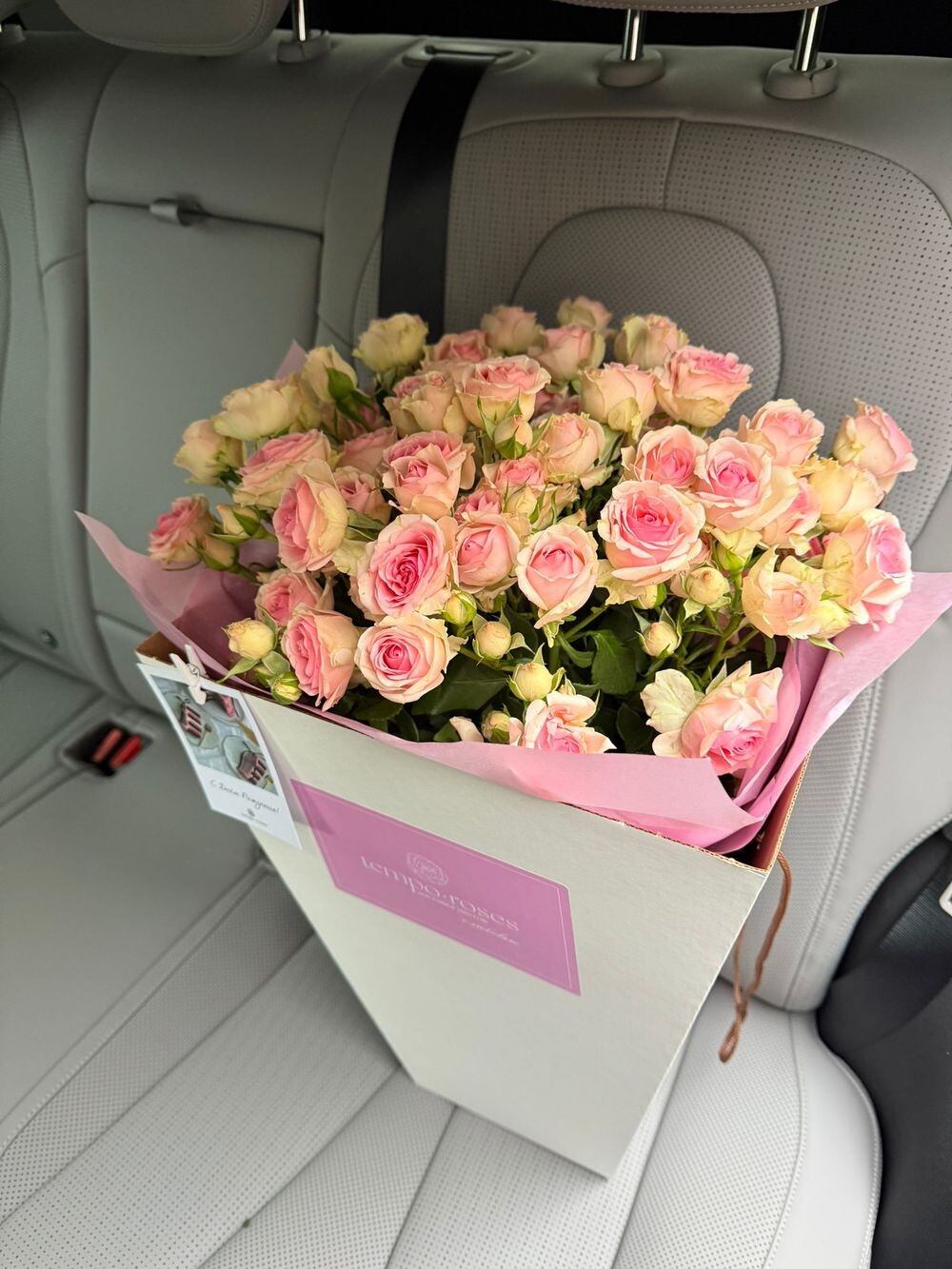 Коробка из 7 кустовых пионовидных роз Джелато + 8 розовых эустом