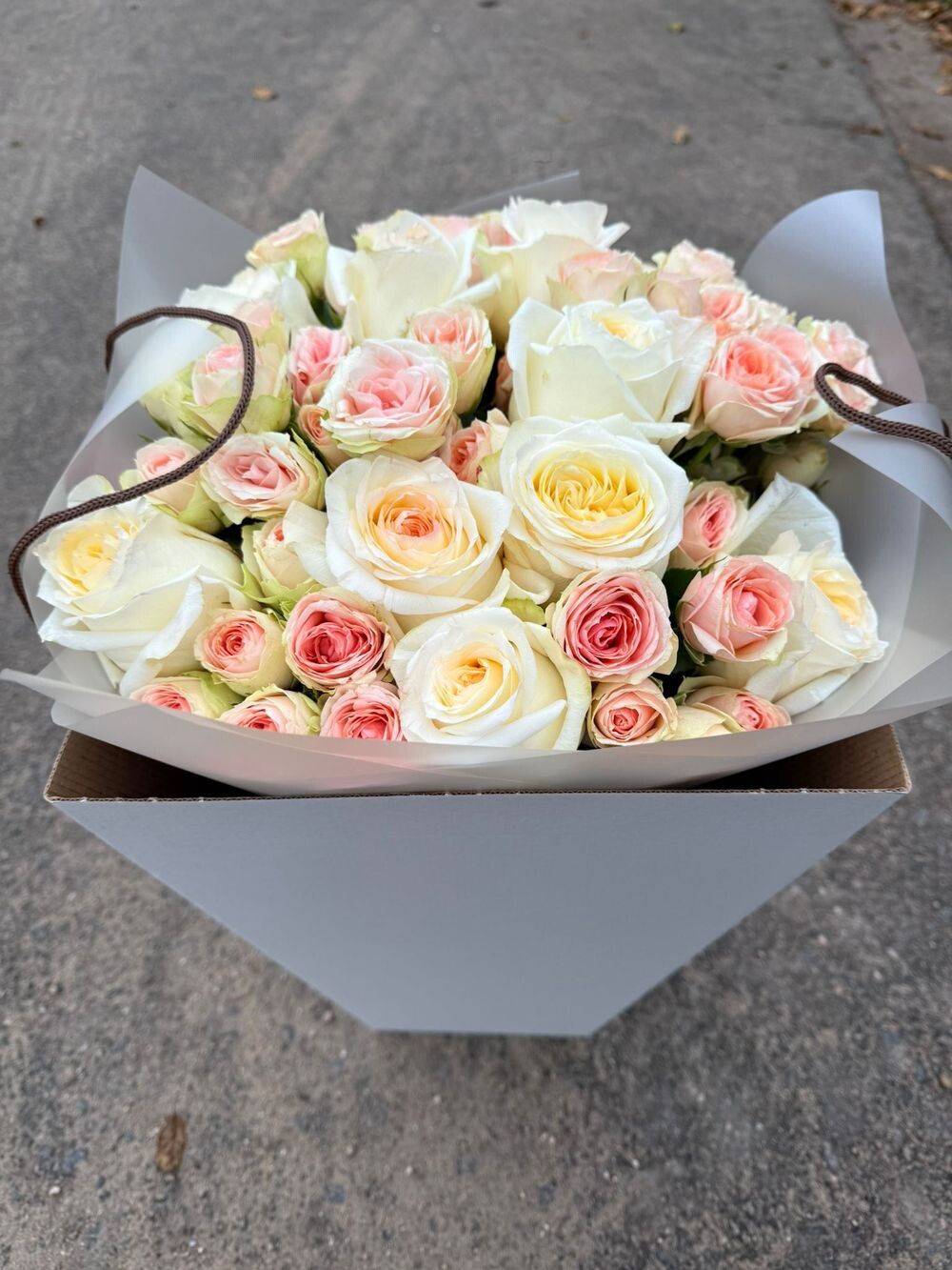 25 кустовых пионовидных роз Giselle в крафт бокале