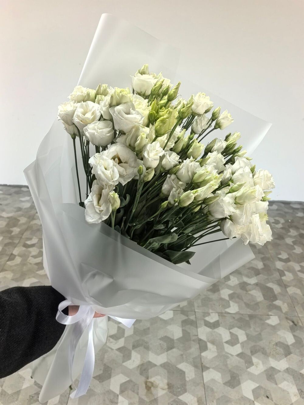 Элегантный букет из 11 белоснежных эустом в матовой упаковке — сдержанный и изысканный. Универсальный подарок: уместен на свадьбу, юбилей или в качестве благодарности.