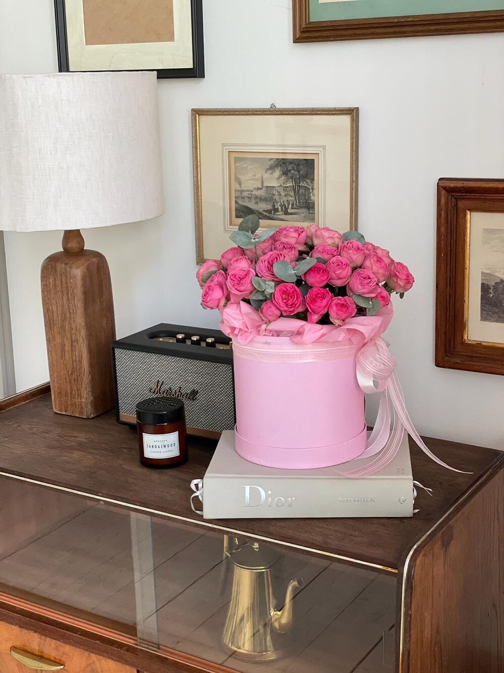 Шляпная коробка с кустовой пионовидной Giselle и эвкалиптом