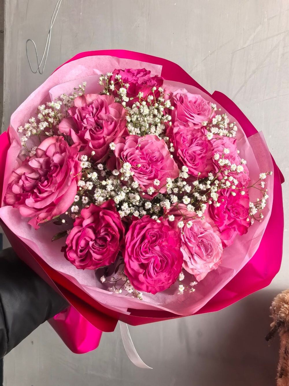 25 пионовидных роз Pink Expression с оформлением