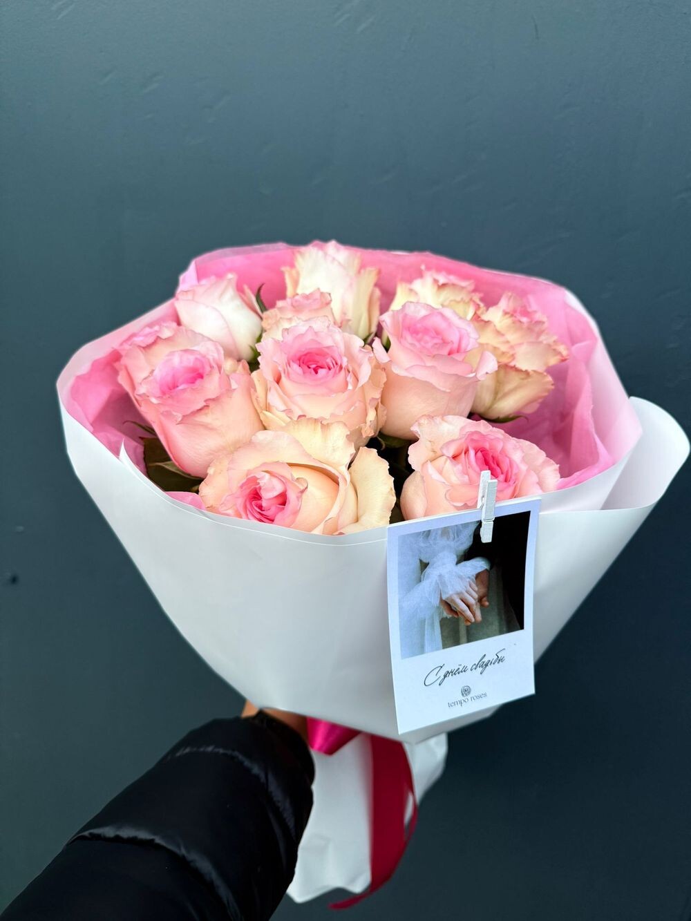 11 роз сорта «Мандала» — двухтонных, розово-белых, с эффектом акварельного перехода — с декоративным оформлением. Художественный, нестандартный букет для творческой натуры.