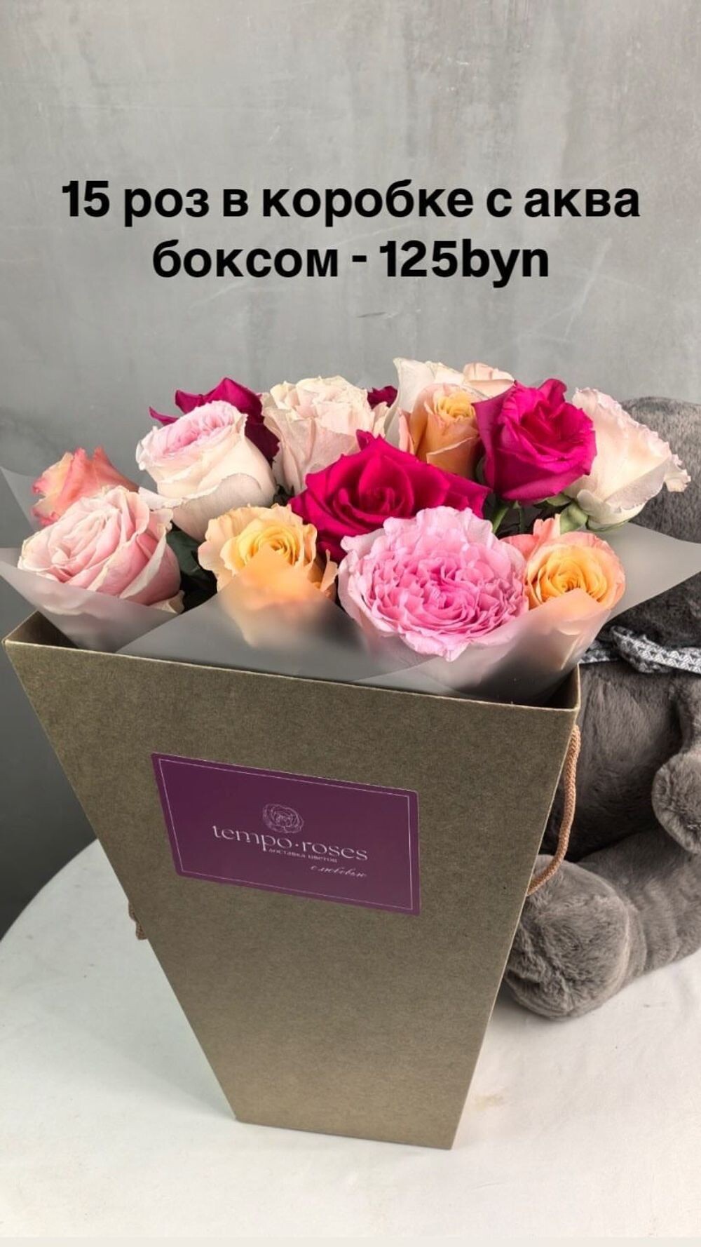 15 роз разных оттенков в подарочной коробке с аква боксом — яркое и праздничное сочетание, готовое к вручению. Цветы дольше сохраняют свежесть благодаря встроенному увлажнению.