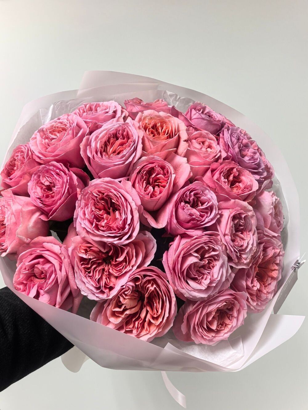 25 ярких пионовидных роз насыщенного малиново-розового цвета с оформлением. Роскошный состав и выразительный цвет — для тех моментов, когда хочется поразить.