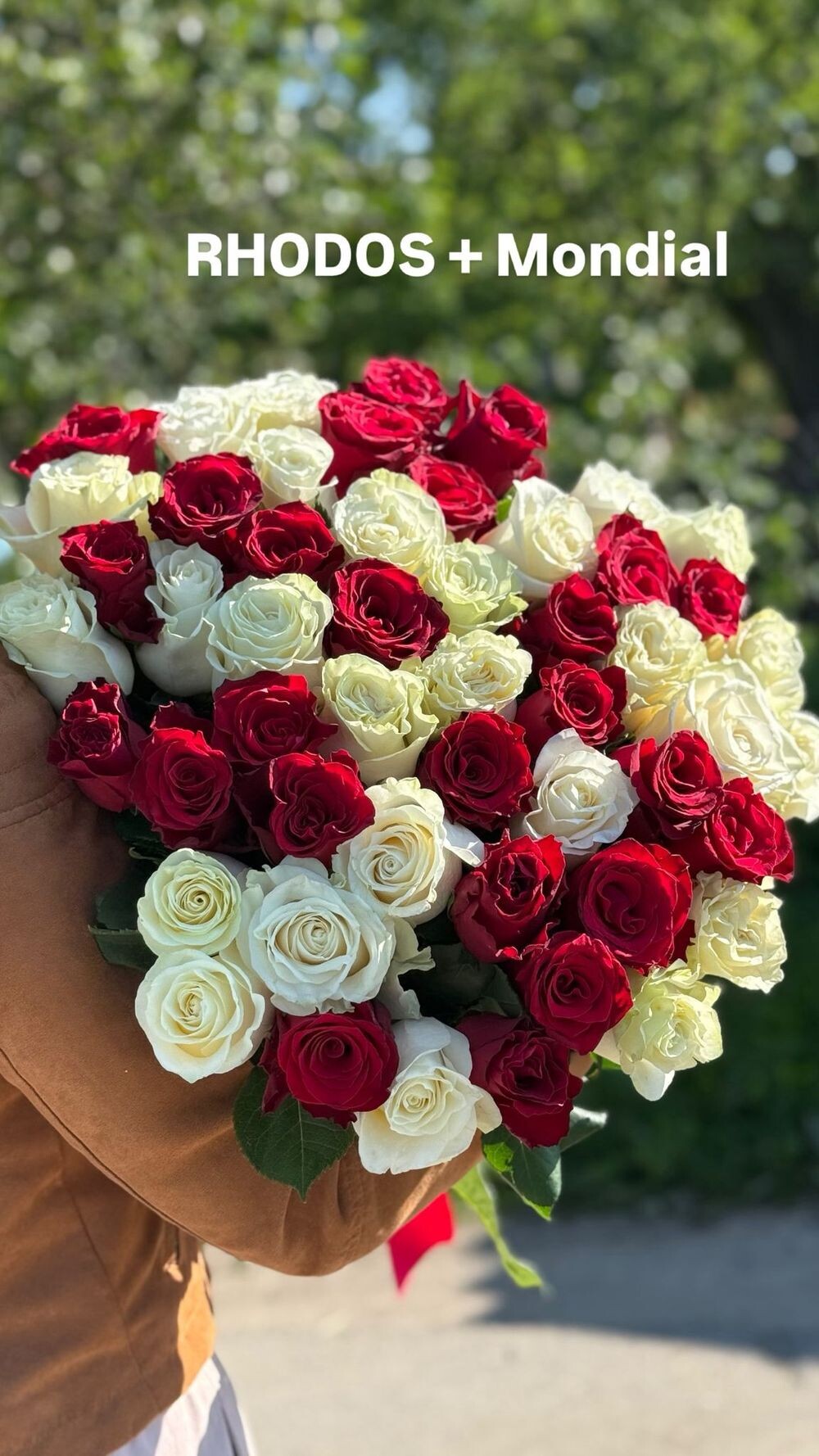 51 роза — кремово-белый «Мондиаль» в паре с яркими кенийскими розами. Богатый, торжественный и щедрый подарок для юбилея или значимой даты.