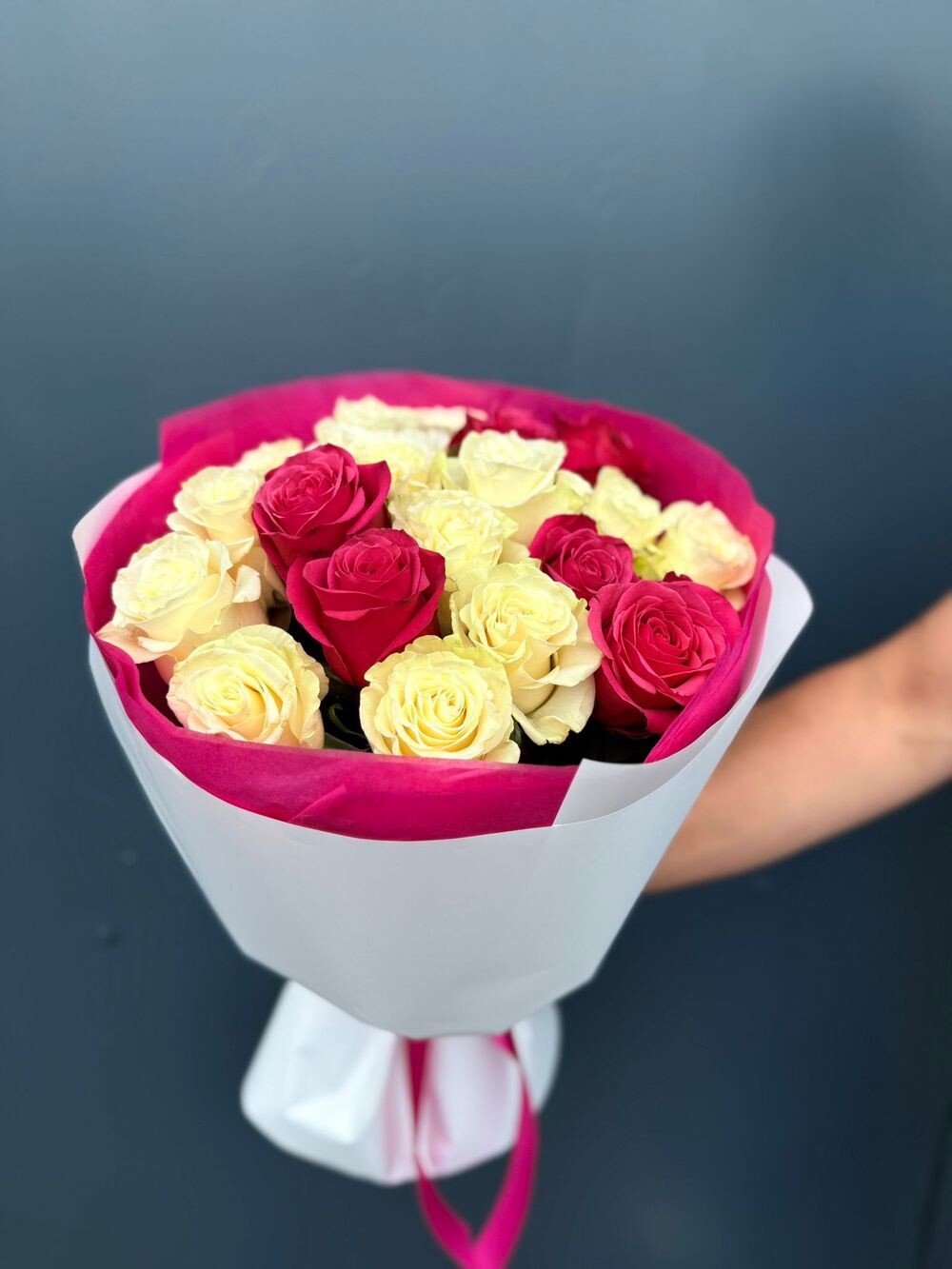 Контрастный и праздничный букет: насыщенные малиновые розы в сочетании с белыми. Выразительная пара, которая притягивает взгляд — для дня рождения или романтического сюрприза.