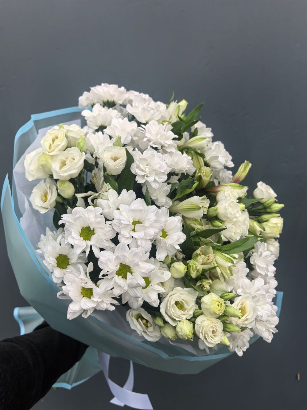 Нежное и воздушное трио: ромашковые хризантемы, яркая альстромерия и пышная эустома. Лёгкий и многослойный букет — для тёплого и искреннего подарка.