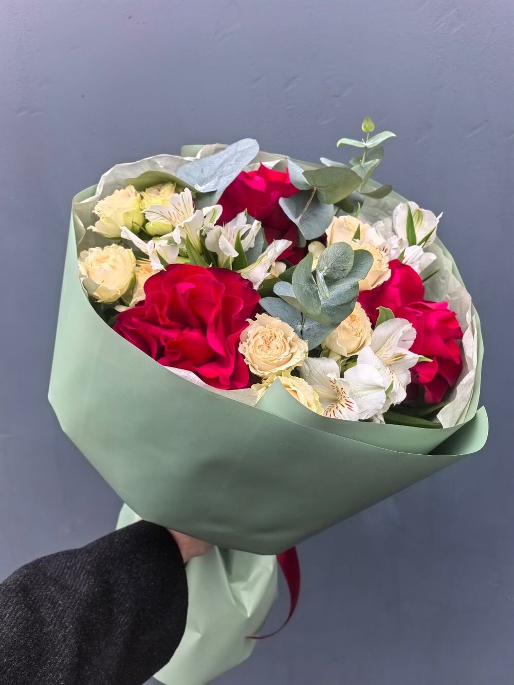 Яркий и страстный букет: красные французские розы, тёплая кустовая «Саммер Роуз» и альстромерия. Насыщенная палитра и богатый состав — для романтического подарка.