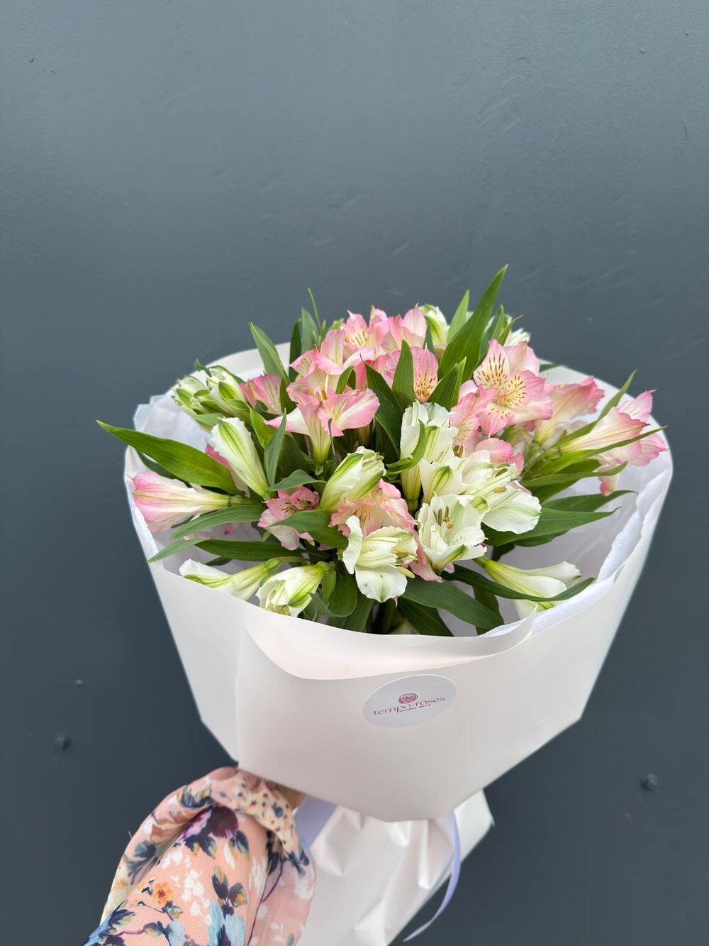 Букет из 10 белых диантусов + 9 розовых альстромерий в сиреневом бокале