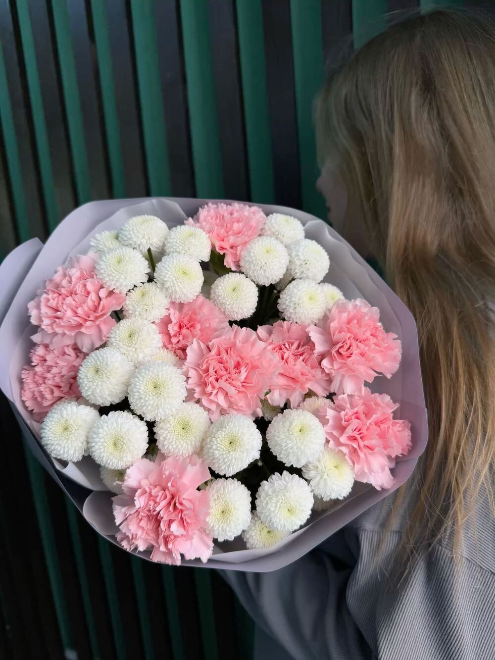 Фактурный и аккуратный букет: крупные шаровидные «Ньютон» в паре с нежными розовыми диантусами. Чистый и стильный образ — для официального или дружеского поздравления.