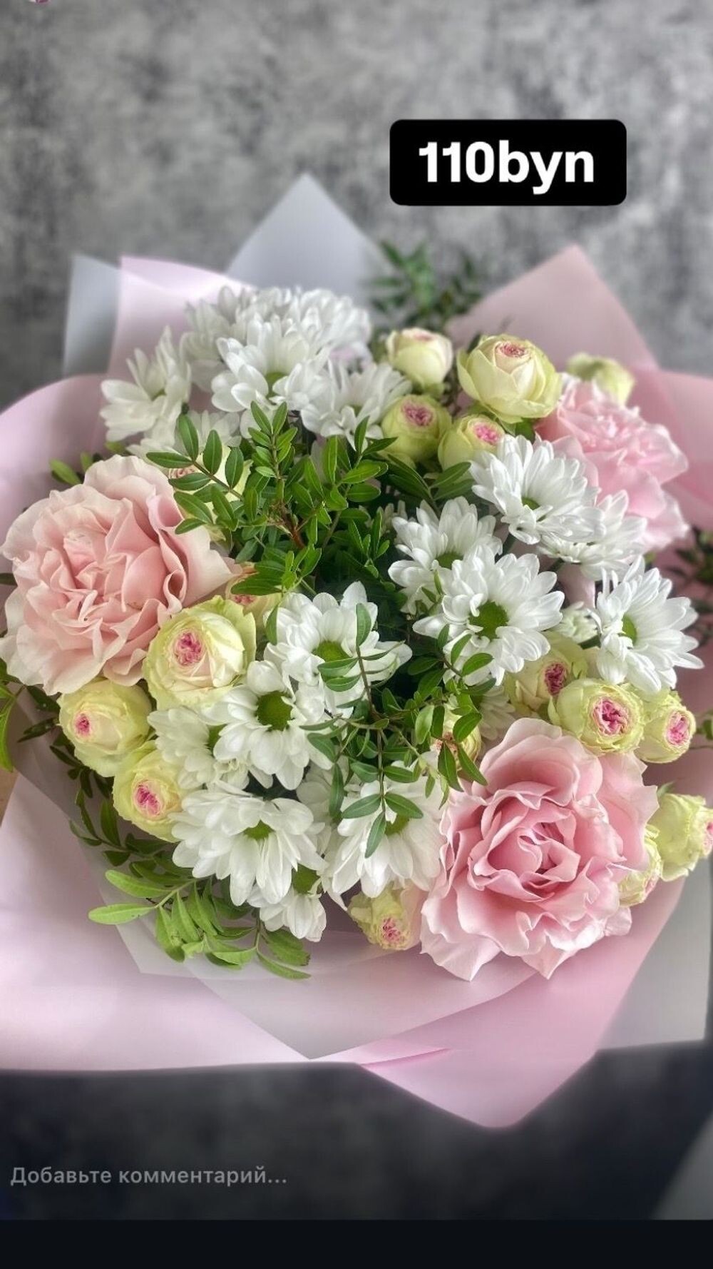 Букет 326 с французскими розами, ромашкой, розовой эустомой