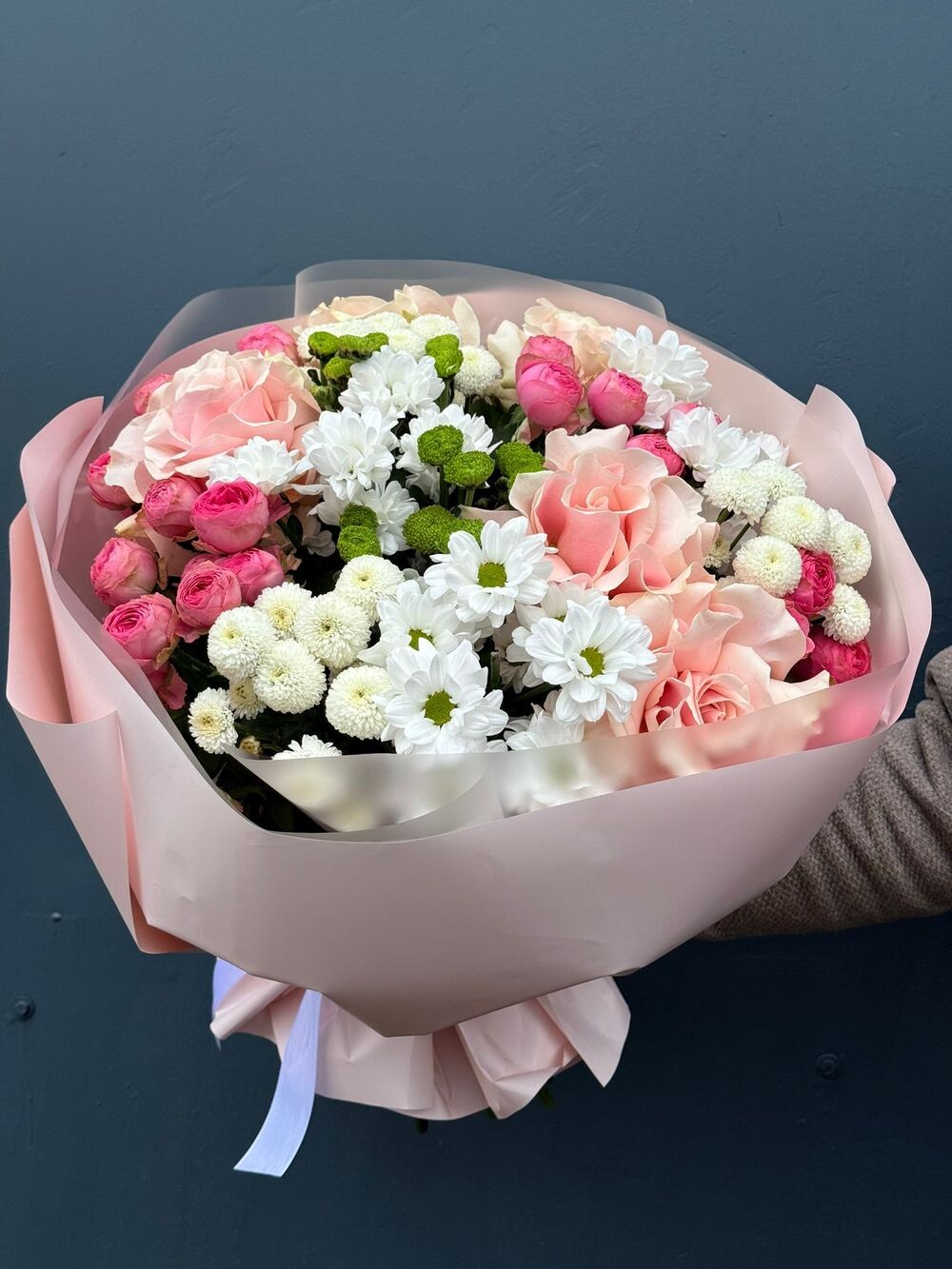 Авторский букет с нестандартным составом: ароматные французские розы, «Жизель», шаровидный «Ньютон» и необычная зелёная «Код Грин». Интересная игра текстур и оттенков для смелого подарка.
