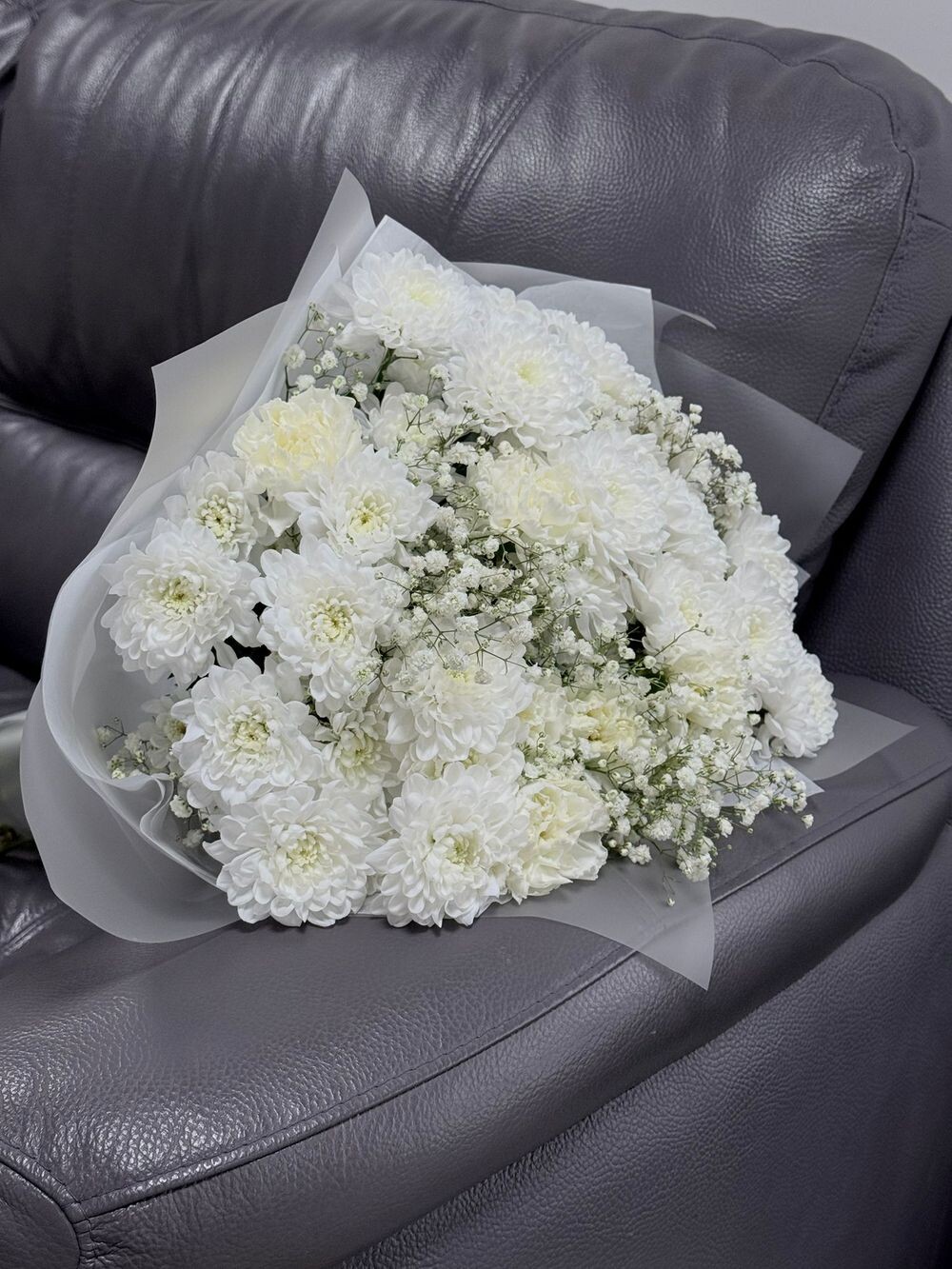 Букет 256 с хризантемой Алтай, гипсофиллой и диантусами