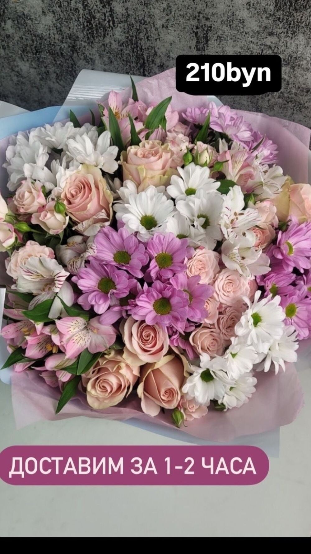 Букет 146 с кустовой Жизель, розовыми ромашками и альстромерией