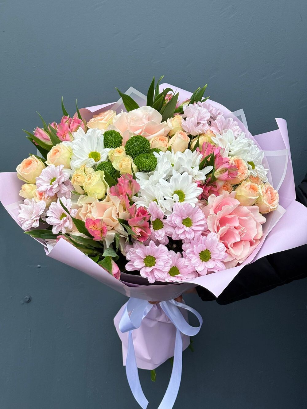 Букет 305 с французскими розами, хризантемой код Грин, Ньютон и альстромерией