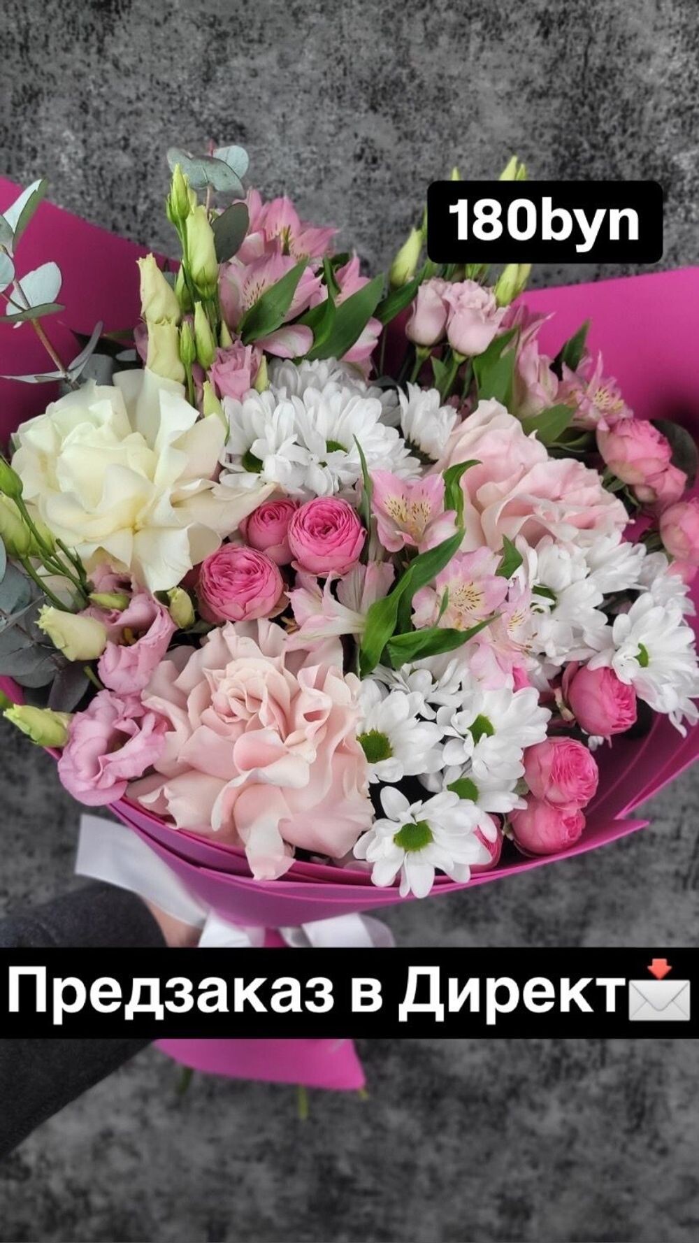 Нежный и многослойный букет: ароматные французские розы, воздушные ромашки и пышная розовая эустома. Женственный и трогательный образ для искреннего поздравления.