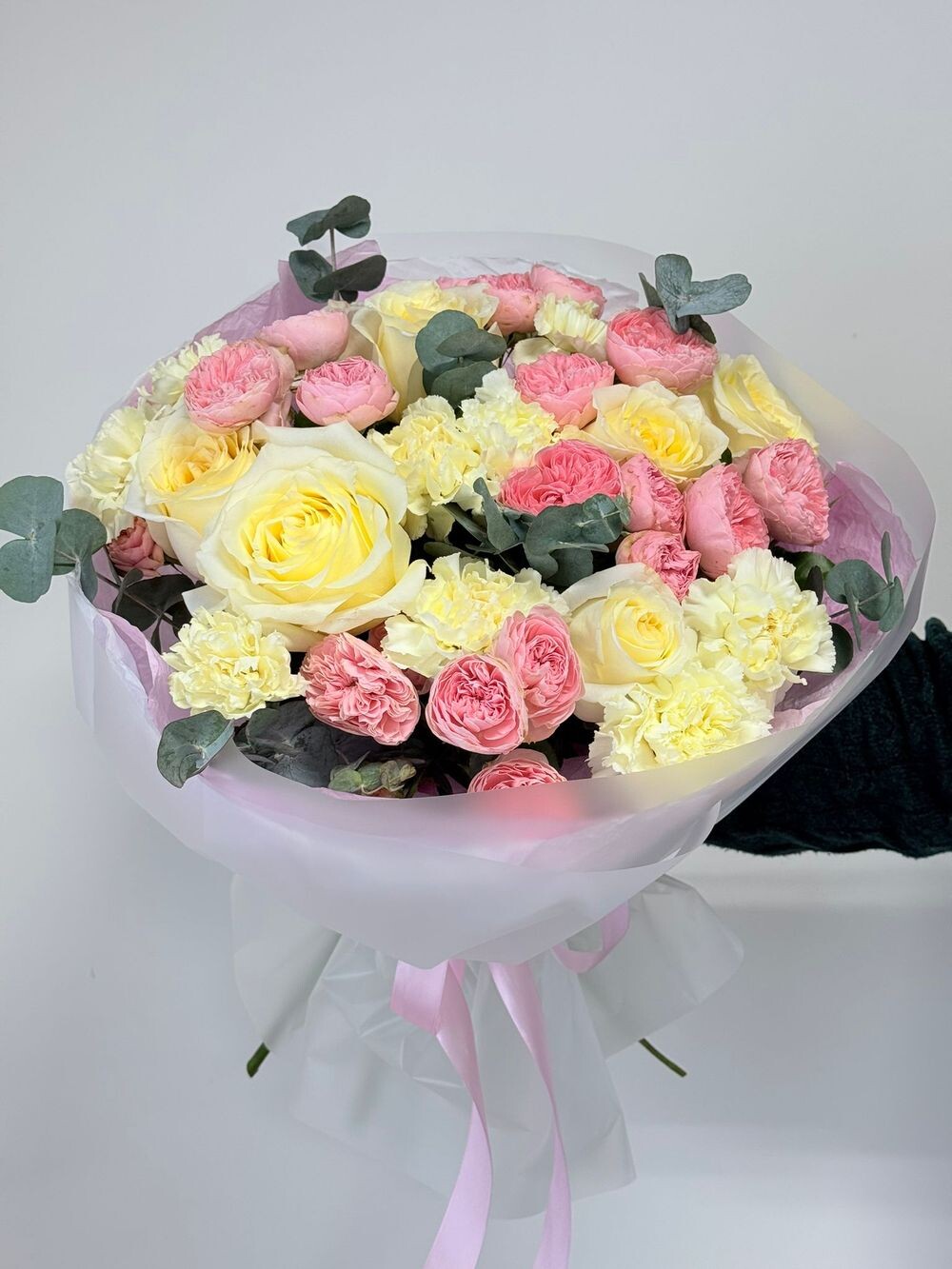 Букет 322 с пионовидными розами кэндлайт, диантусами и кустовыми Саммер Роуз