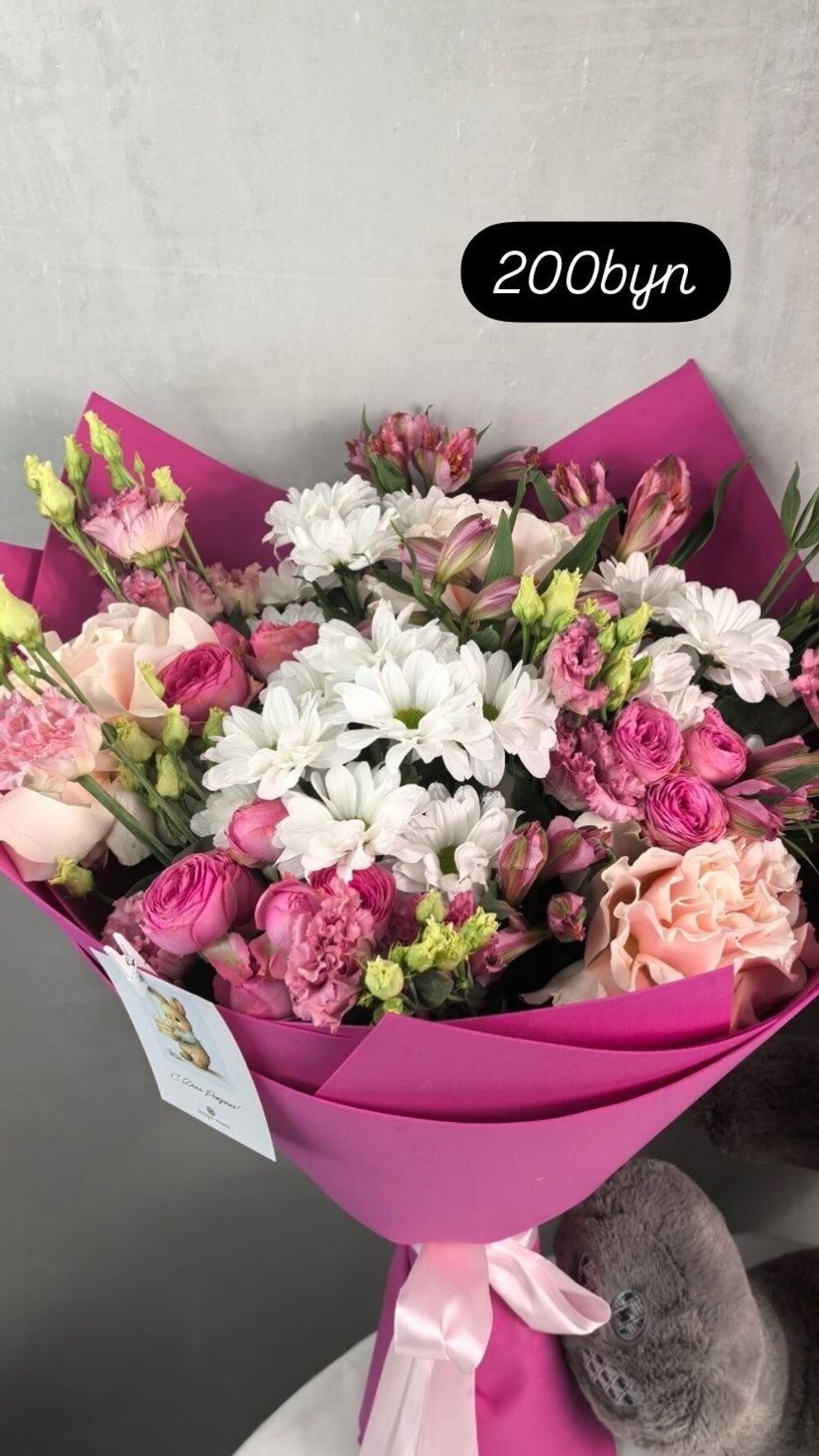 Лёгкий и женственный букет: ромашковые хризантемы, нежно-розовая кустовая «Жизель» и пышная эустома. Весенний, трогательный образ — для мамы, подруги или учителя.