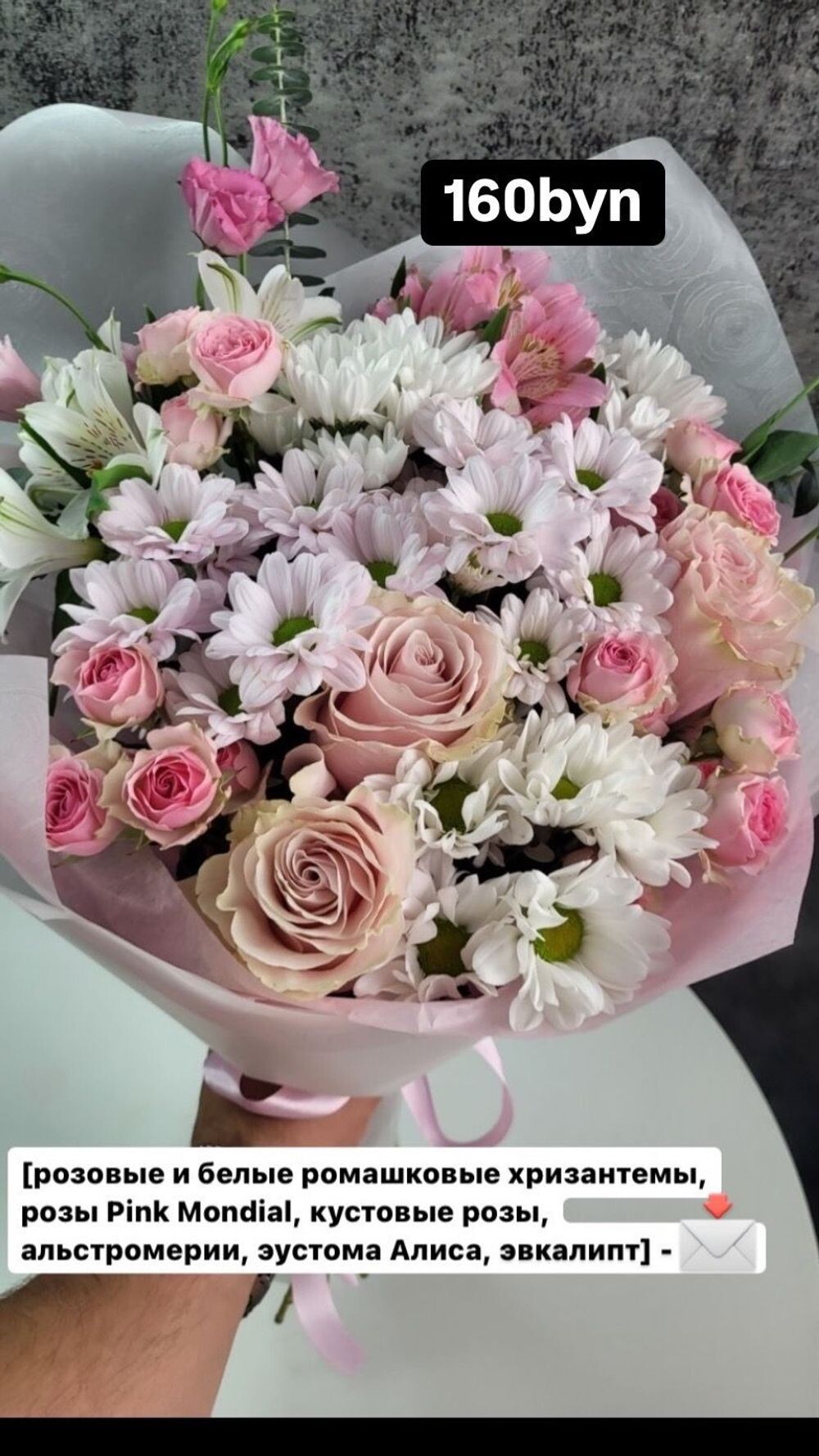 Букет 299 с розами Пинк мондиаль, кустовой розой, ромашками и альстромерией