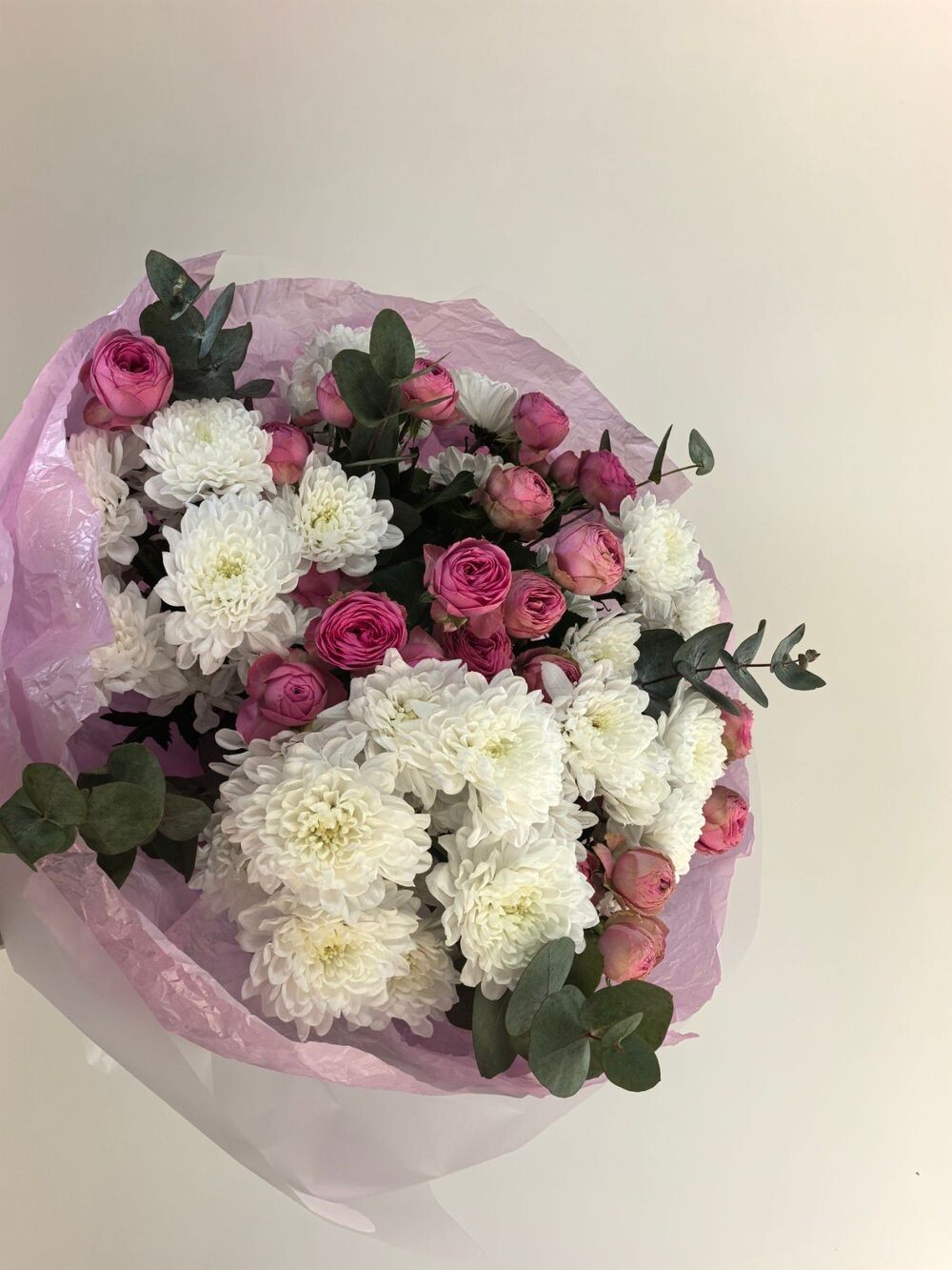 Букет 88 с хризантемой Алтай, кустовой Жизель и эвкалиптом