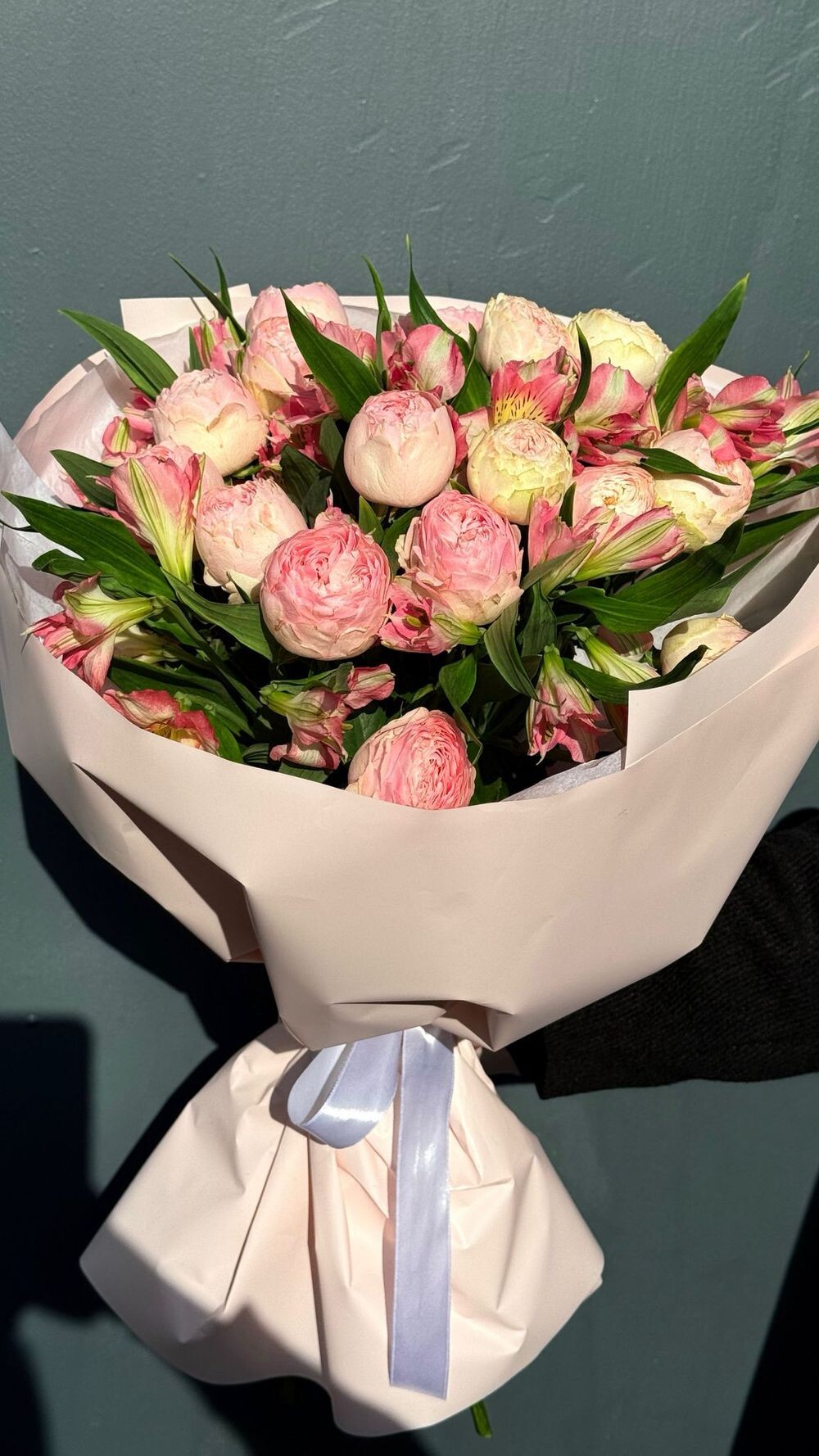 Пышная кустовая «Мэнсфилд Парк» кремово-розового оттенка в паре с яркой альстромерией. Живой и тёплый букет — для подруги, коллеги или в знак благодарности.