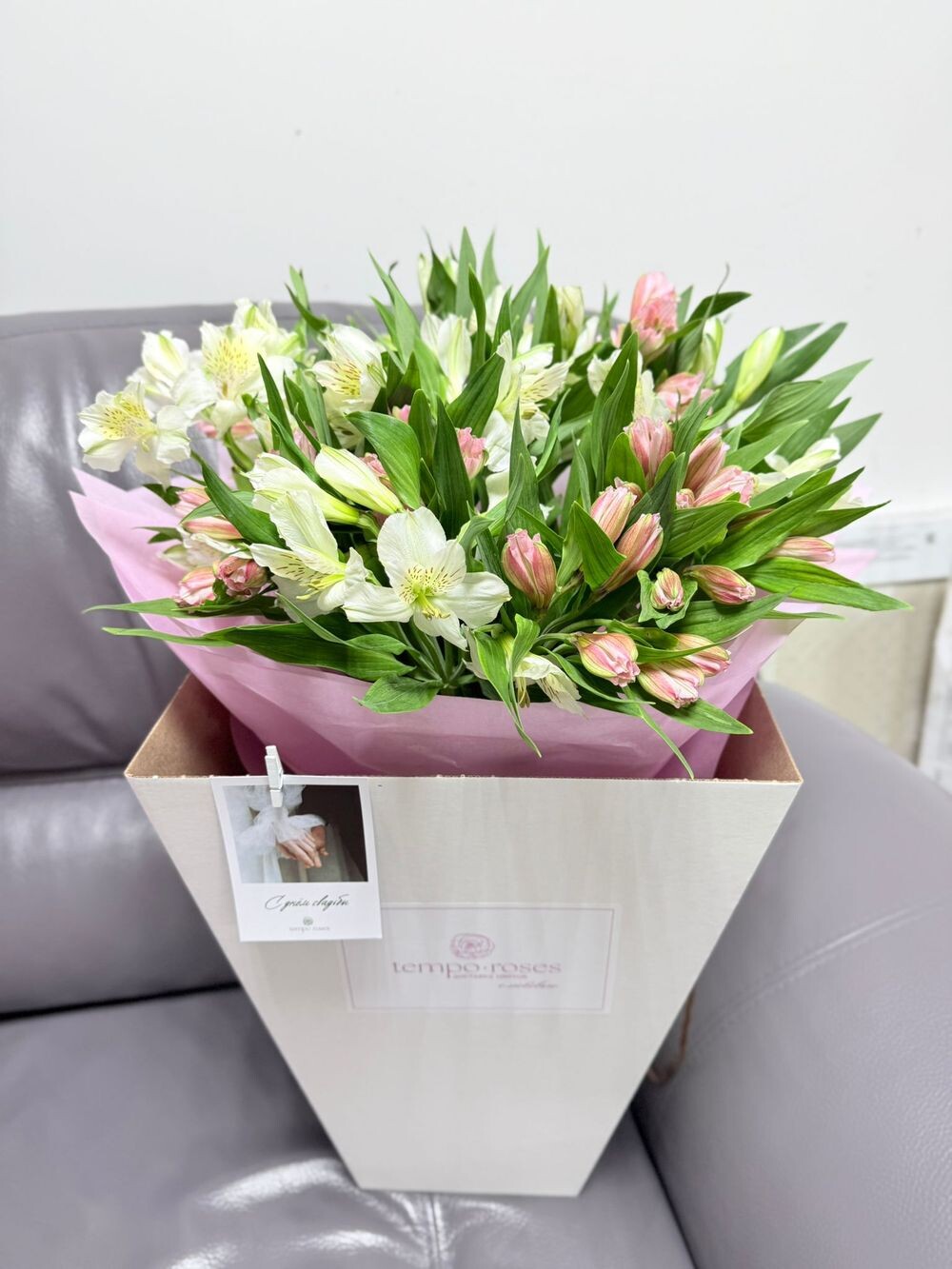 Яркая и жизнерадостная коробка с 17 ветками альстромерии разных оттенков. Аква бокс сохраняет цветы свежими прямо в упаковке — можно дарить без вазы. Отличный подарок подруге или коллеге: альстромерия символизирует дружбу и долгую привязанность.
