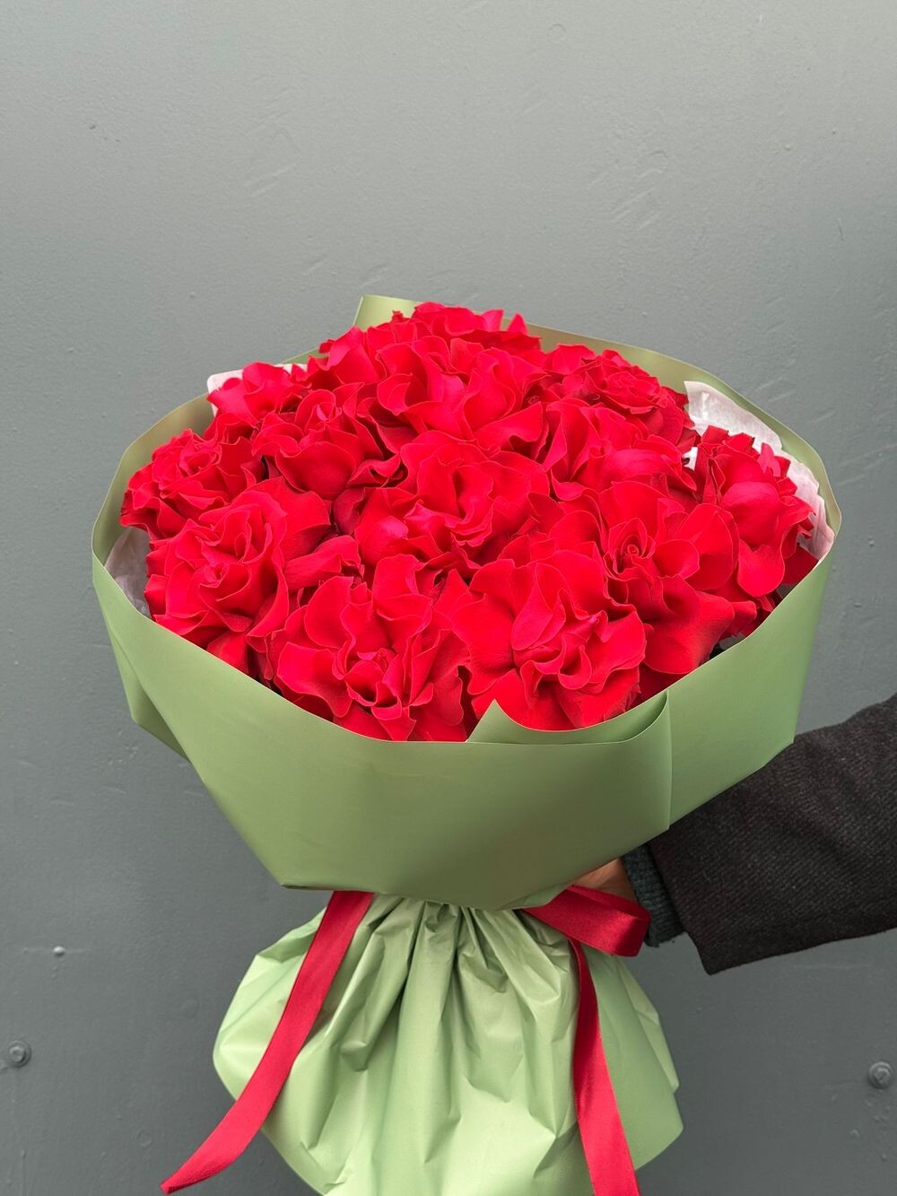 Классический букет из 15 красных французских роз в стильной зелёной упаковке. Яркий акцент для признаний, торжеств и особых моментов.