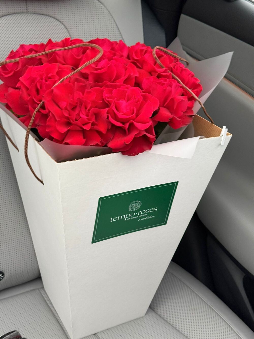 Роскошная композиция из 15 красных французских роз в коробке с аквабоксом, который сохраняет свежесть цветов дольше. Практичный и эффектный подарок.