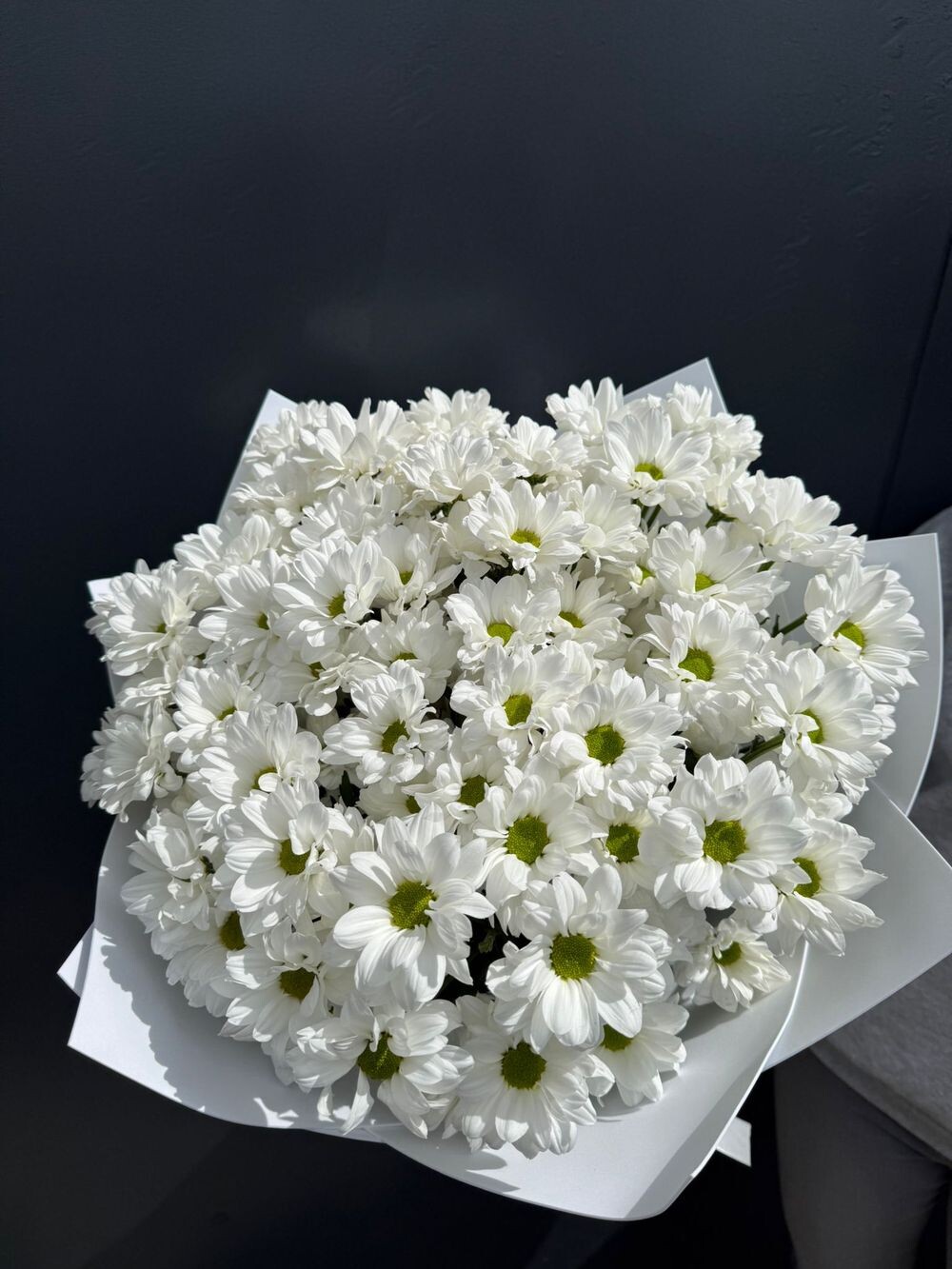 Нежный букет из 11 белых ромашковых хризантем, оформленный в белый фоамиран. Лёгкий и свежий образ, подчёркивающий естественную красоту цветов.