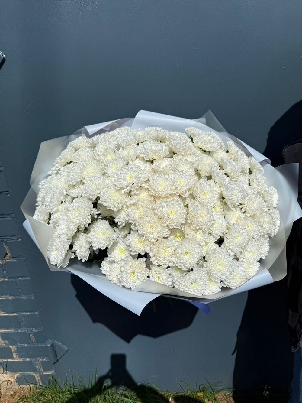 Пышная композиция из 25 хризантем сорта Алтай с декоративным оформлением. Подходит для значимых событий и поздравлений.