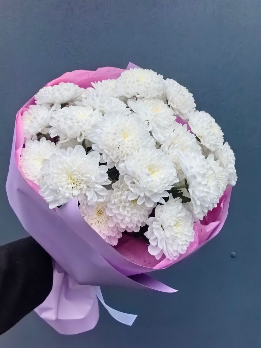 Компактный букет из 5 хризантем Алтай с аккуратным оформлением. Подходит для небольшого подарка или знака внимания.