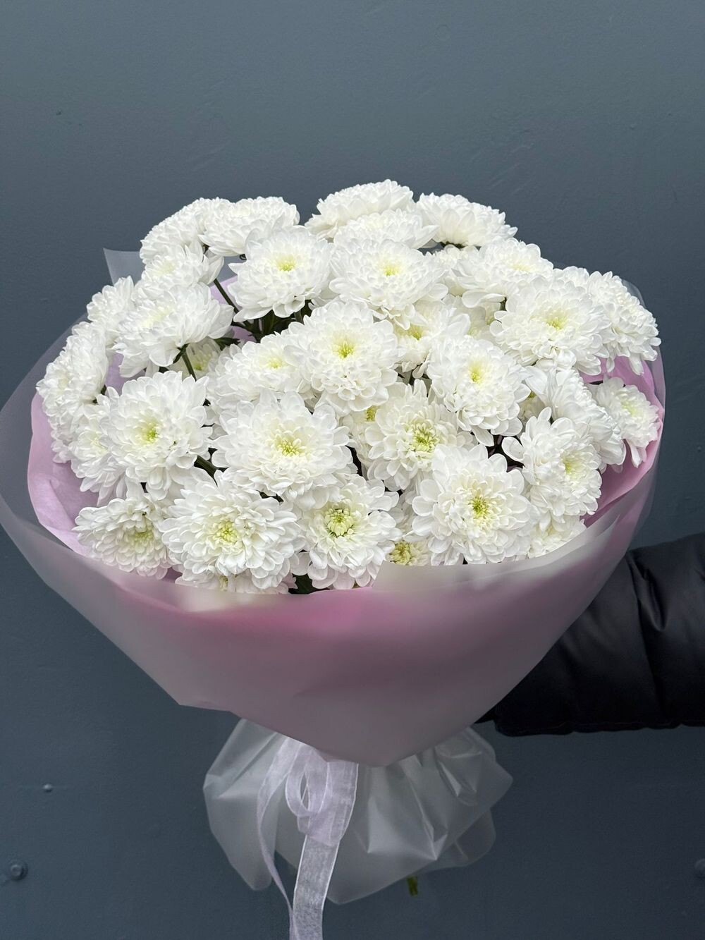 Стильный букет из 7 хризантем Алтай в матовой упаковке. Современное и аккуратное оформление.