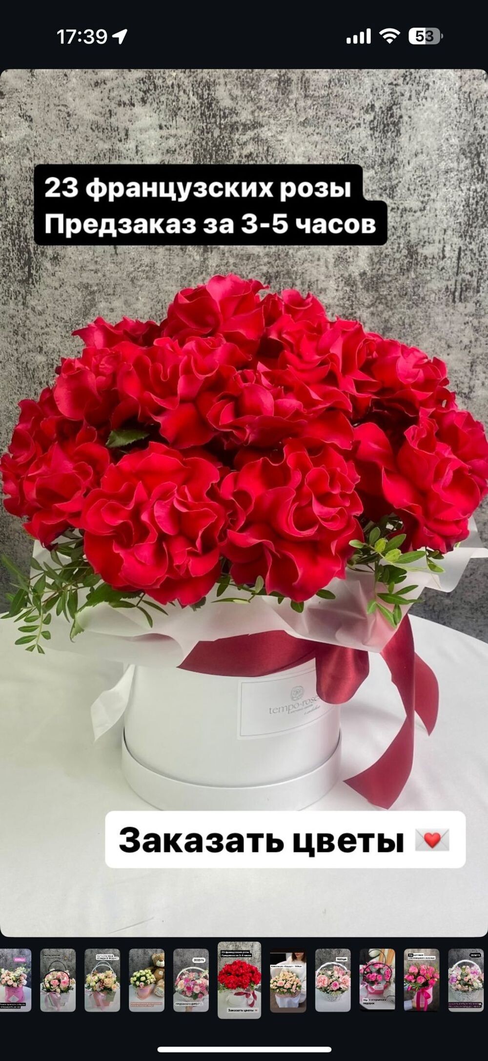 Пышная композиция из 23 красных французских роз с добавлением зелени в белой коробке. Классика с ярким акцентом.