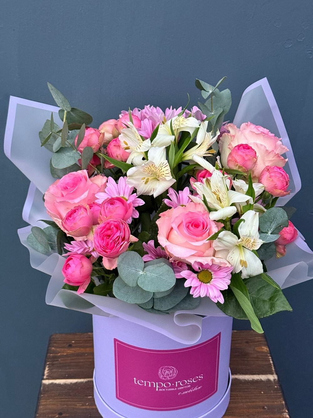 Компактная и аккуратная цветочная композиция в шляпной коробке.
