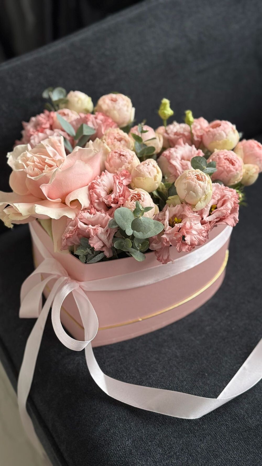 Шляпная коробка с кустовой пионовидной Жизель с эвкалиптом