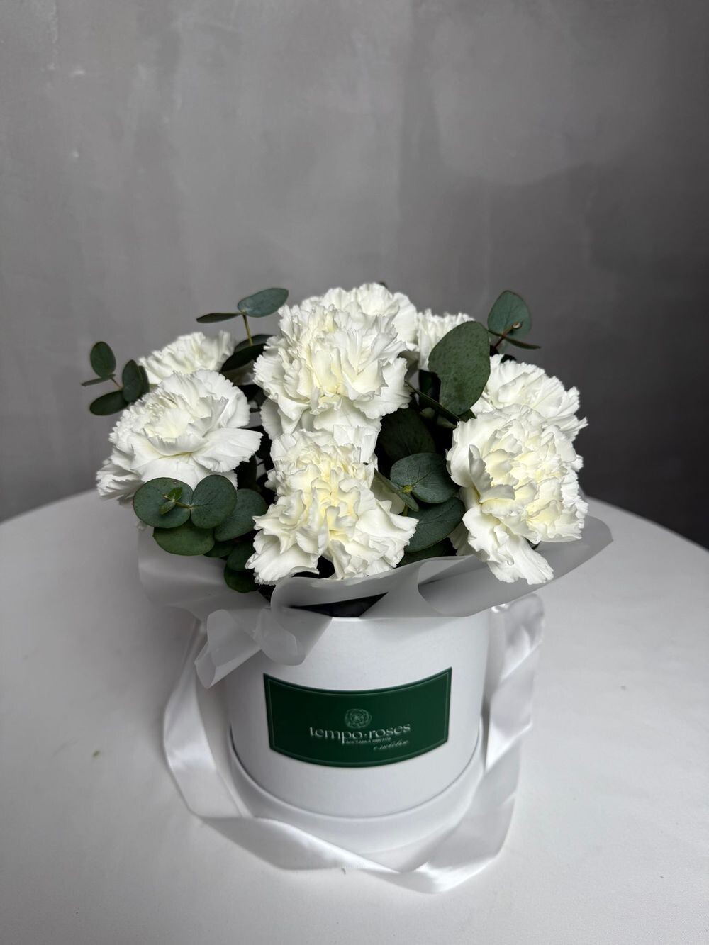 Коробочка с белыми диантусами и эвкалиптом (шляпная)
