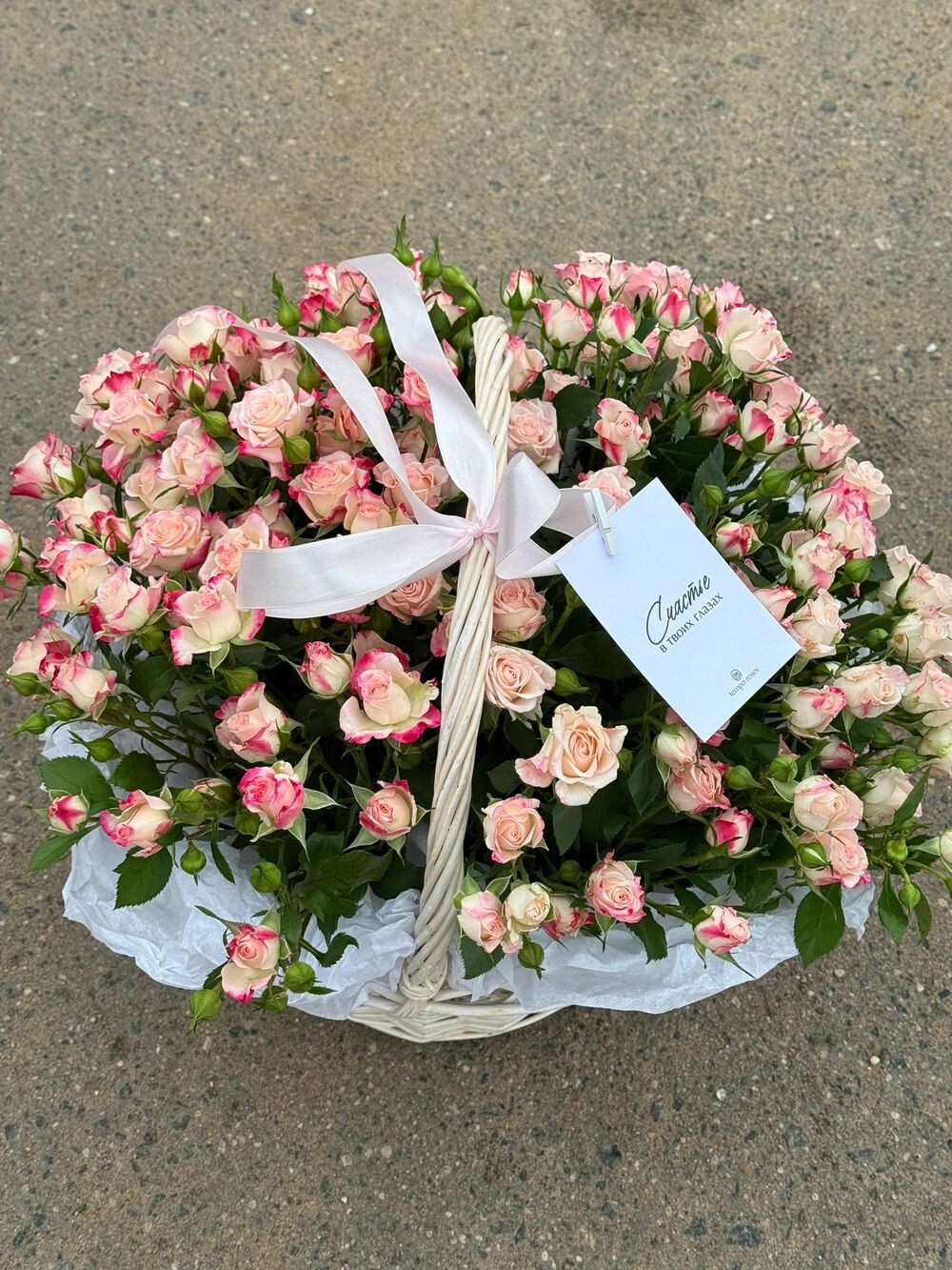 Изящная корзина с 21 кустовой розой сорта «Рефлекс» — нежно-розового пастельного оттенка с мягкими округлыми бутонами. Число 21 придаёт особый смысл поздравлению. Для романтического подарка или значимого события.