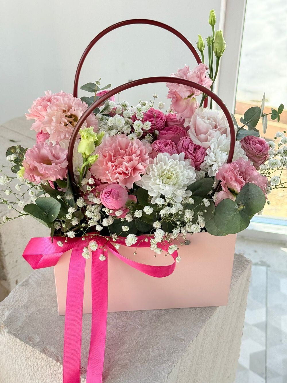 Практичная и стильная сумочка с белой эустомой и ароматными диантусами. Название говорит само за себя: цветы в такой упаковке остаются свежими дольше обычного. Удобный формат для подарка в дороге или на мероприятии.