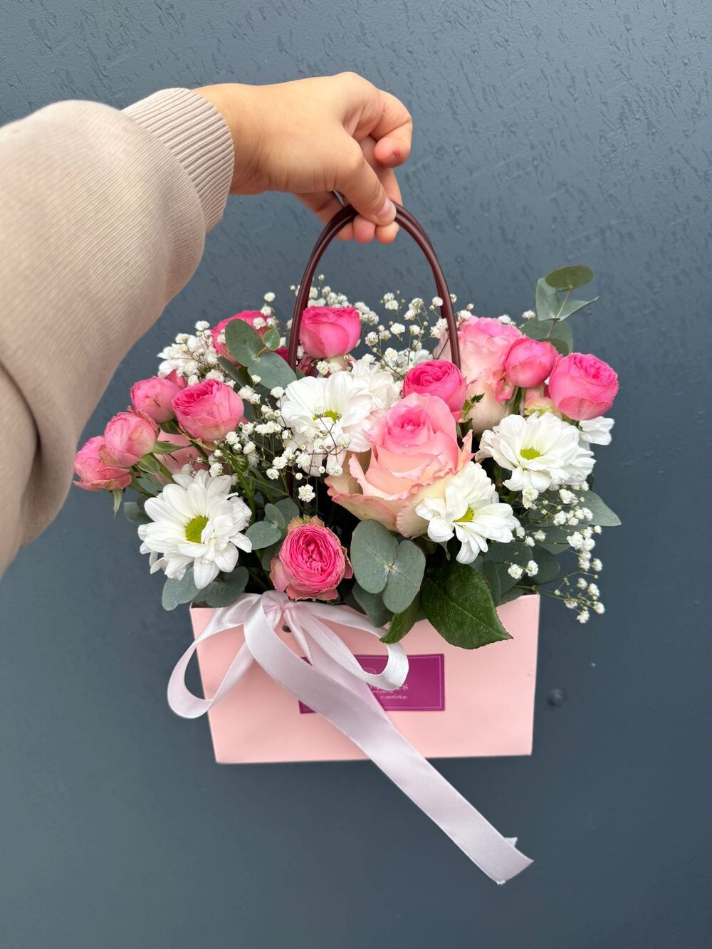 Сумочка с пионовидными розами Пинк Экспрешн и эустомой