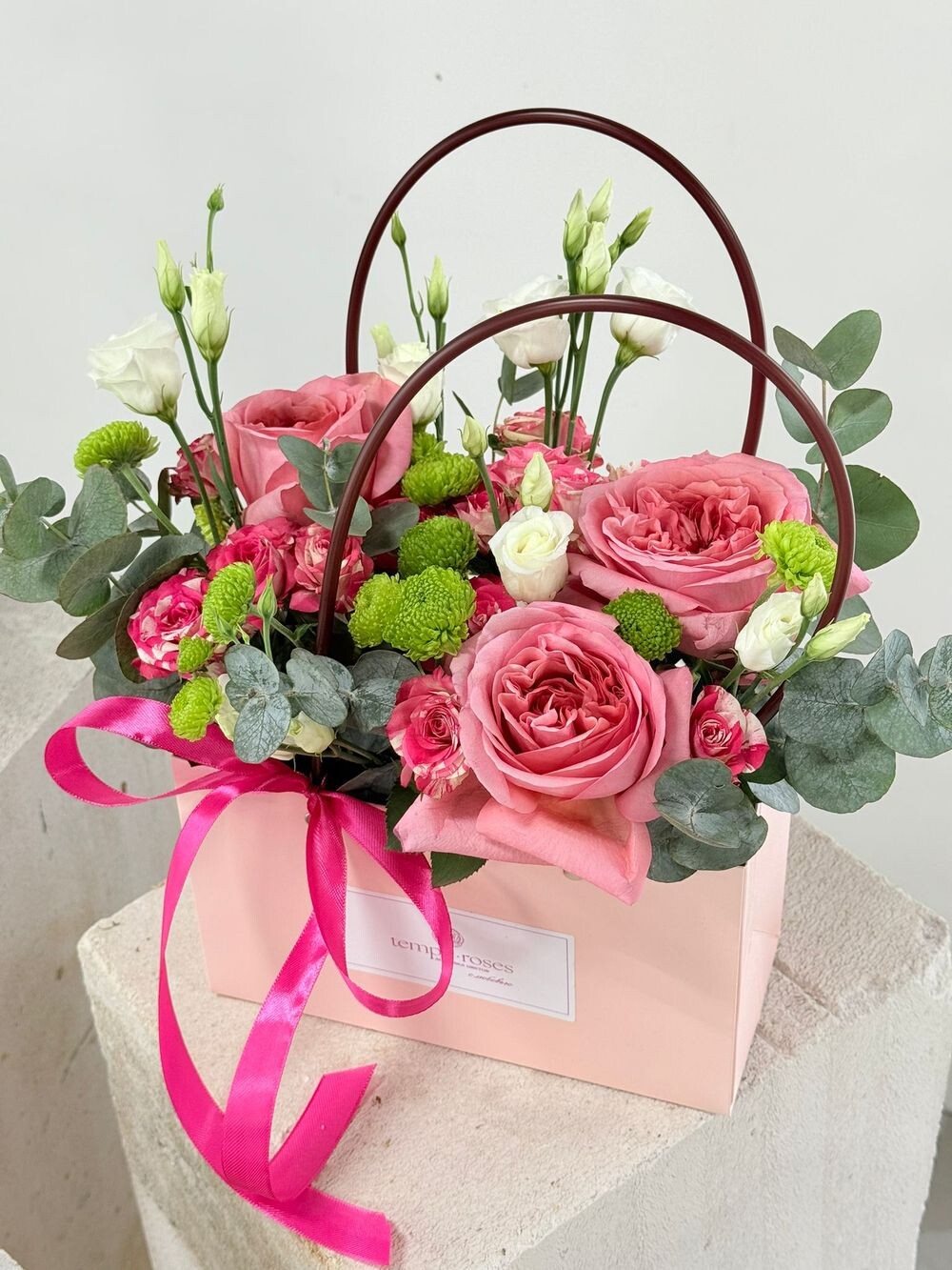Сумочка с пионовидными розами Пинк Экспрешн и эустомой