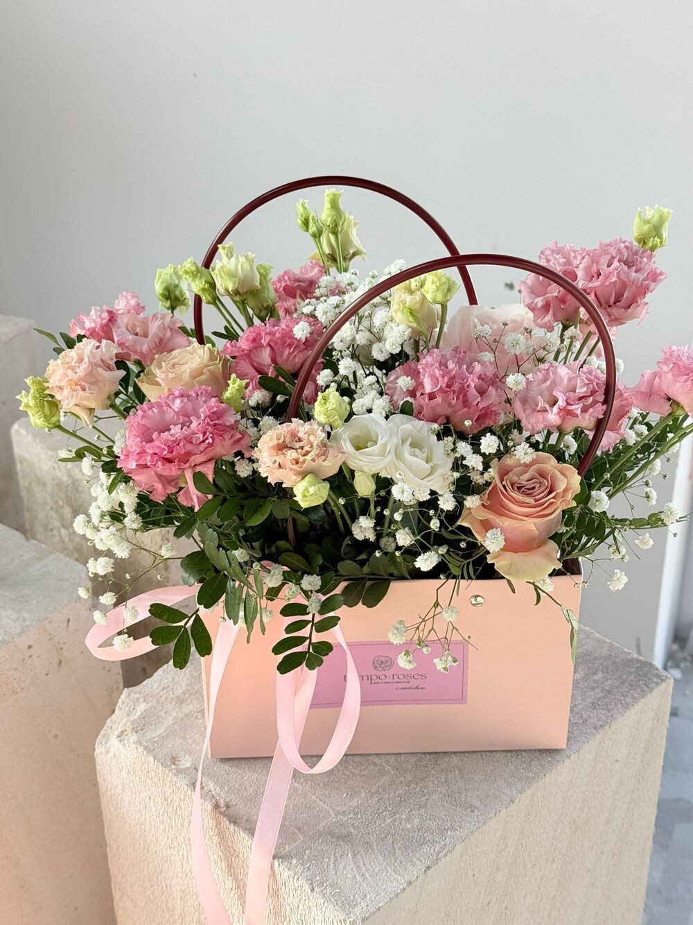 Элегантная сумочка с белоснежной или нежно-розовой эустомой — утончённый и деликатный подарок. Эустома долго сохраняет свежесть и выглядит дорого. Подходит для учителя, коллеги или в знак уважения.