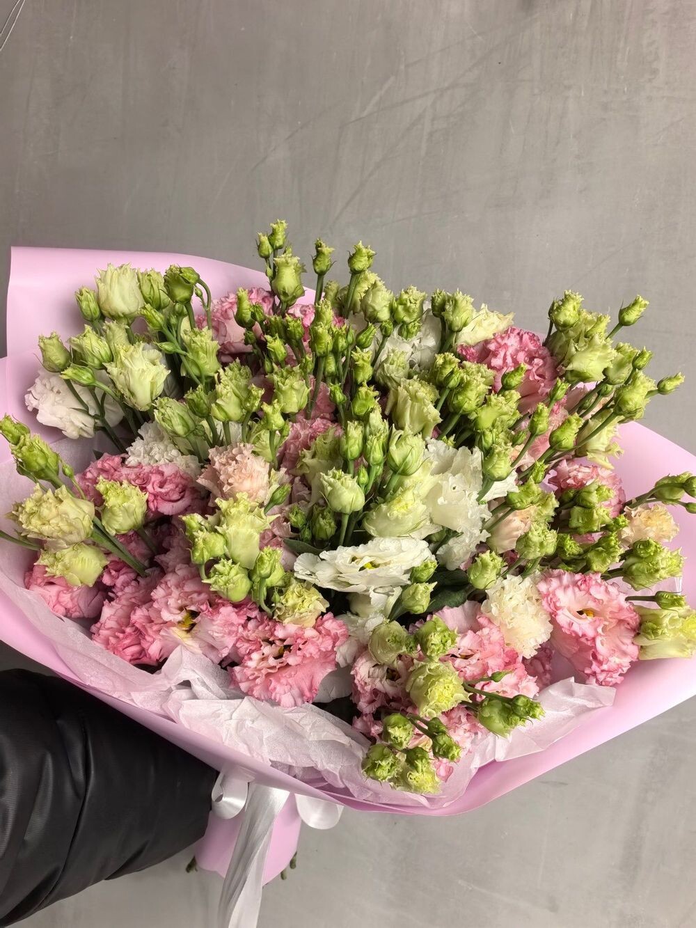 Роскошный букет из 15 эустом разных оттенков в нежно-розовой упаковке. Пышные бутоны напоминают розы — выглядит дорого, дарит искреннее восхищение. Подойдёт на день рождения, 8 марта или годовщину.