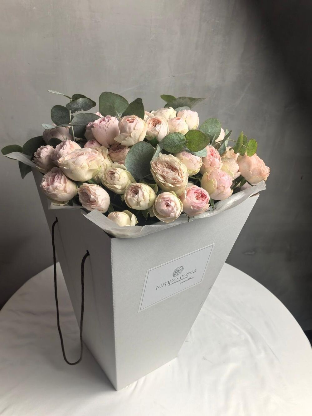 Роскошная авторская коробка: 19 пионовидных роз сорта «Мэнсфилд Парк» с веточками свежего эвкалипта. Кремово-розовые пышные бутоны в сочетании с зеленью — богатый, ботанический образ. Достойный подарок на юбилей или значимое событие.
