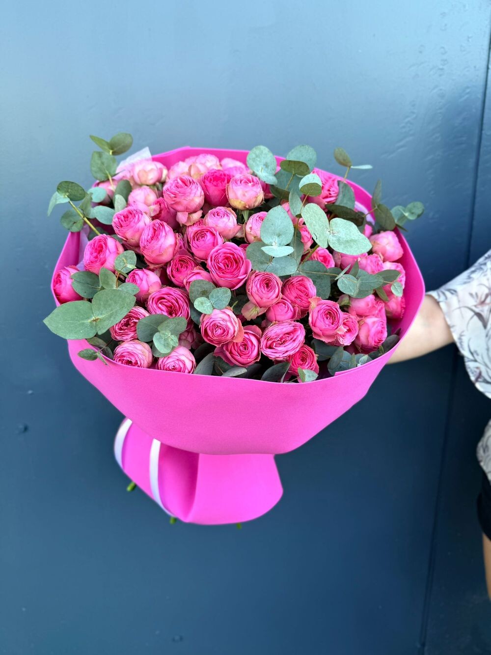 Нежный букет из 19 веток Giselle с добавлением эвкалипта. Лёгкость и натуральность в оформлении.