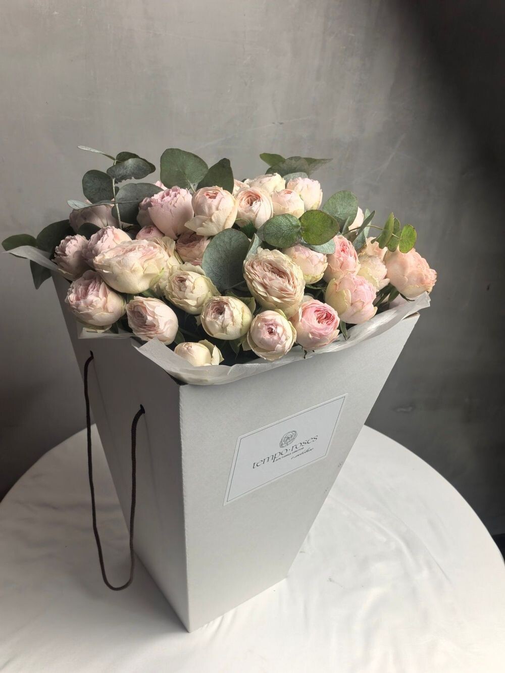 Элегантная композиция из 19 веток Мэнсфилд Парк с эвкалиптом в коробке с аквабоксом. Гармония формы и свежести.
