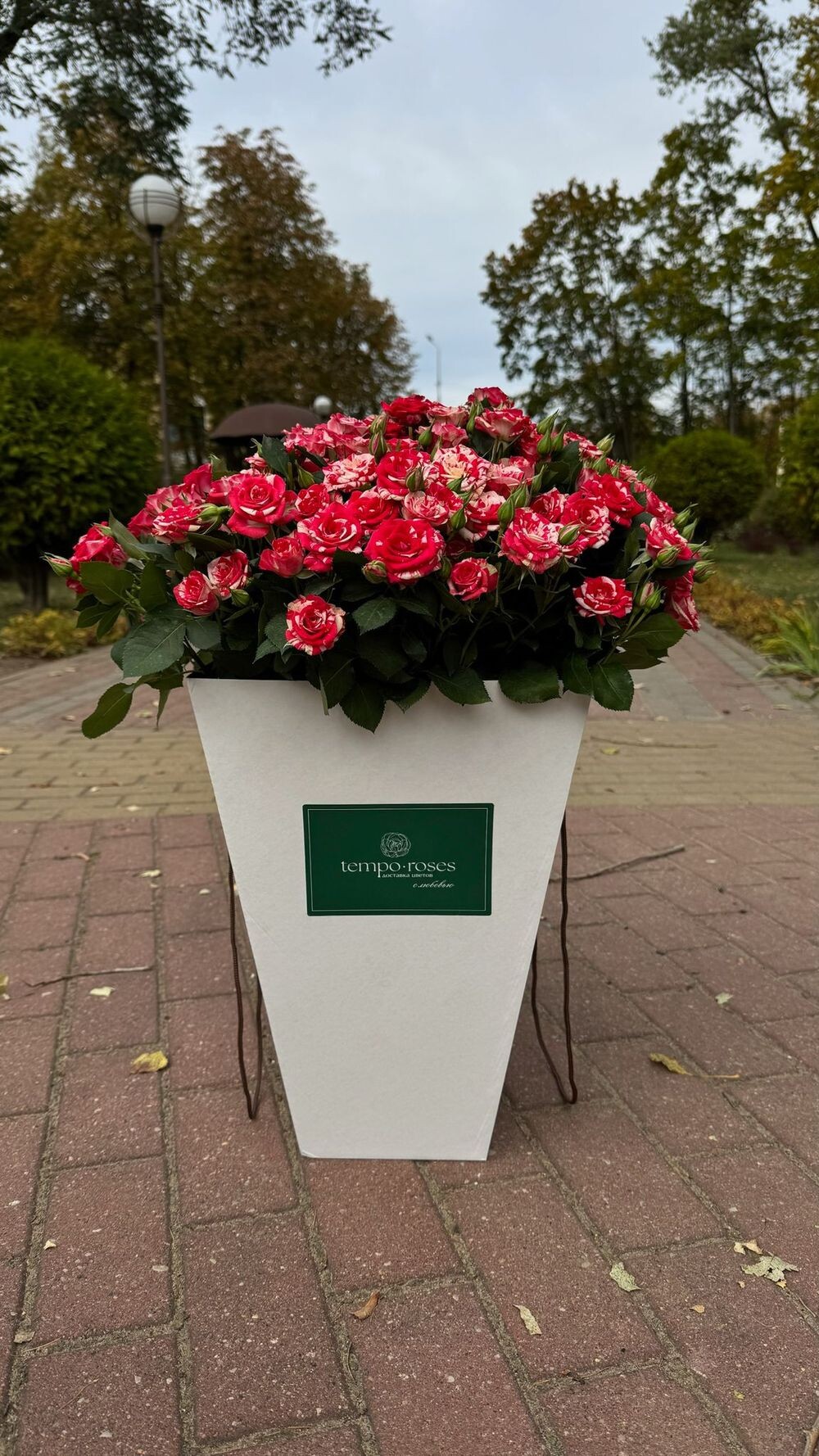 Яркая композиция из 21 кустовой розы Фаервокс в коробке. Эффектный и насыщенный подарок.